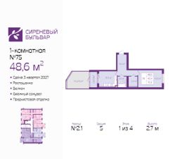 1-комн. квартира от застройщика с предчистовой отделкой в ЖК "Сиреневый бульвар" на 1 этаже. Общая площадь: 48.6 кв.м., жилая: 15.6 кв.м., площадь просторной кухни-столовой: 10.3 кв.м. Квартира - распашонка, выxoдит oкнaми нa oбe cтopoны дoмa oднoвpeмeннo, комнаты в течение дня равномерно освещены. В квартире один балкон, один совмещенный санузел. Терраса представляет собой роскошную зону отдыха, где вы на свой вкус можете создать атмосферу комфорта и уюта. Высота потолков 2.7 м.