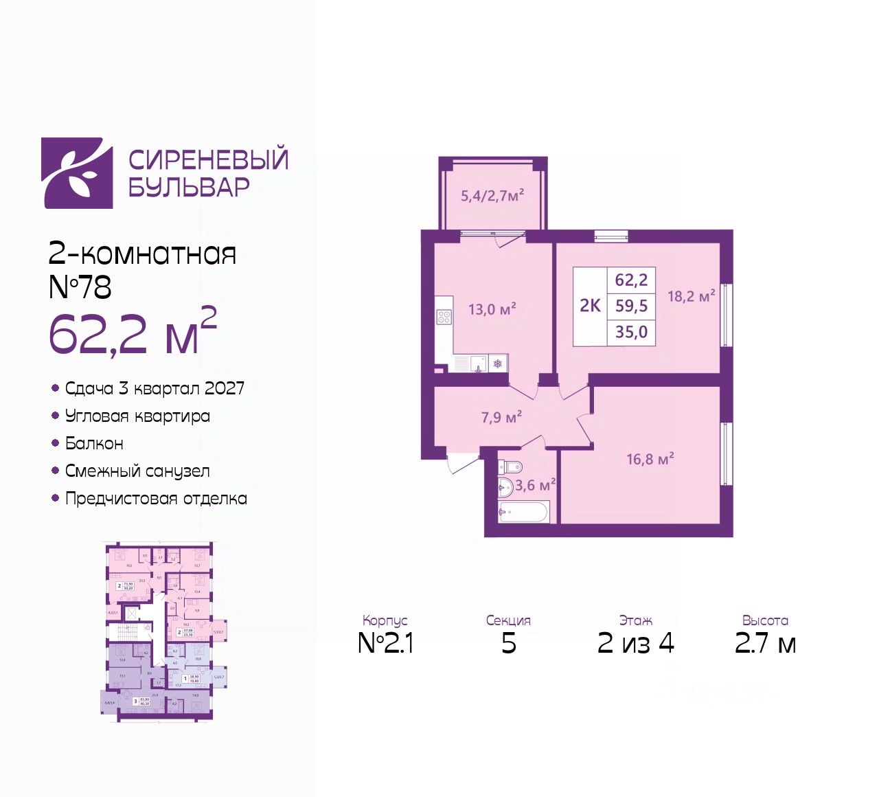 Двухкомнатная квартира с предчистовой отделкой в ЖК "Сиреневый бульвар" на 2 этаже. Общая площадь: 62.2 кв.м., жилая: 35.3 кв.м., площадь просторной кухни-столовой: 13 кв.м. Квартира угловая, идеально подойдет любителям тишины и панорамных видов. В квартире один балкон, один совмещенный санузел. Высота потолков 2.7 м.