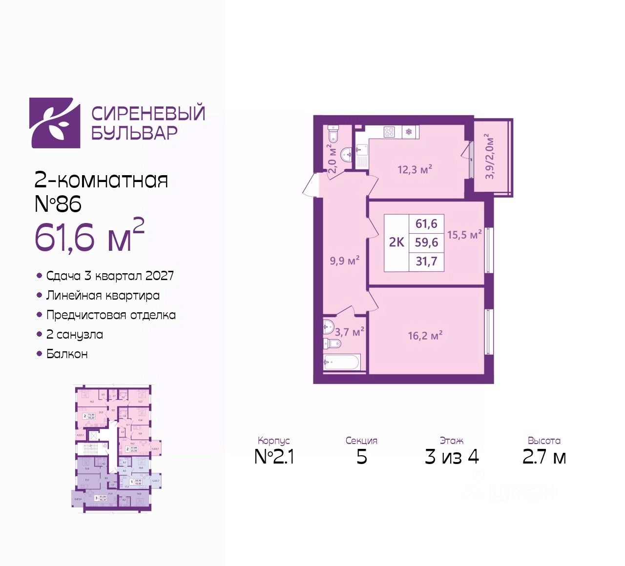2-комн. квартира от застройщика с предчистовой отделкой в ЖК "Сиреневый бульвар" на 3 этаже. Общая площадь: 61.6 кв.м., жилая: 31.7 кв.м., площадь просторной кухни-столовой: 12.3 кв.м. Комнаты изолированные, все окна выходят на одну сторону. В квартире один балкон, один совмещенный и один раздельный санузел. Высота потолков 2.7 м.