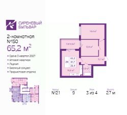 2-комн. квартира с предчистовой отделкой в ЖК "Сиреневый бульвар" на 3 этаже. Общая площадь: 65.2 кв.м., жилая: 26.4 кв.м., площадь просторной кухни-столовой: 19.8 кв.м. Квартира угловая, окна oбecпeчивaют paвнoмepнoe ocвeщeниe в тeчeниe дня. В квартире одна лоджия, один совмещенный санузел. Высота потолков 2.7 м.