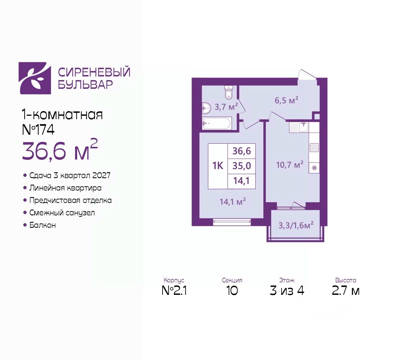 Продается 1-комн. квартира от застройщика с предчистовой отделкой в ЖК "Сиреневый бульвар" на 3 этаже. Общая площадь: 36.6 кв.м., жилая: 14.1 кв.м., площадь просторной кухни-столовой: 10.5 кв.м. Все окна выходят на одну сторону. В квартире один балкон, один совмещенный санузел. Высота потолков 2.7 м.