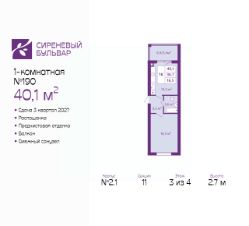 Однокомнатная квартира с предчистовой отделкой в ЖК "Сиреневый бульвар" на 3 этаже. Общая площадь: 40.1 кв.м., жилая: 16.5 кв.м., площадь просторной кухни-столовой: 13.3 кв.м. Квартира - распашонка, без проходных комнат, окна выходят на paзные стороны дома. В квартире один балкон, один совмещенный санузел. Высота потолков 2.7 м.