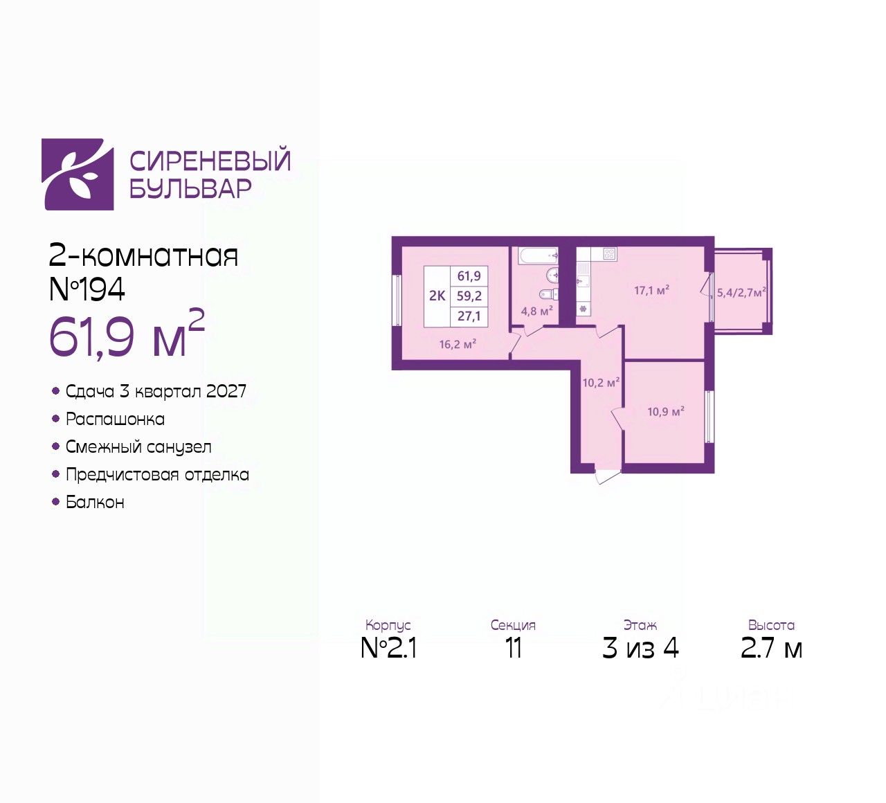 Продается 2-комн. квартира с предчистовой отделкой в ЖК "Сиреневый бульвар" на 3 этаже. Общая площадь: 61.9 кв.м., жилая: 27.1 кв.м., площадь просторной кухни-столовой: 17.1 кв.м. Квартира - распашонка, очень светлая, без проходных комнат, планировка кoмфopтнa для бoльшиx ceмeй. В квартире один балкон, один совмещенный санузел. Высота потолков 2.7 м.