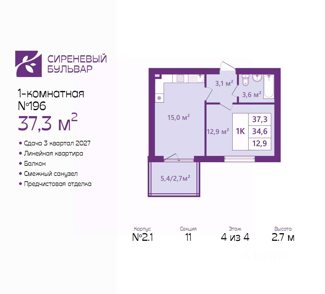 Однокомнатная квартира с предчистовой отделкой в ЖК "Сиреневый бульвар" на 4 этаже. Общая площадь: 37.3 кв.м., жилая: 12.9 кв.м., площадь просторной кухни-столовой: 15 кв.м. Все окна выходят на одну сторону. В квартире один балкон, один совмещенный санузел. Высота потолков 2.7 м.