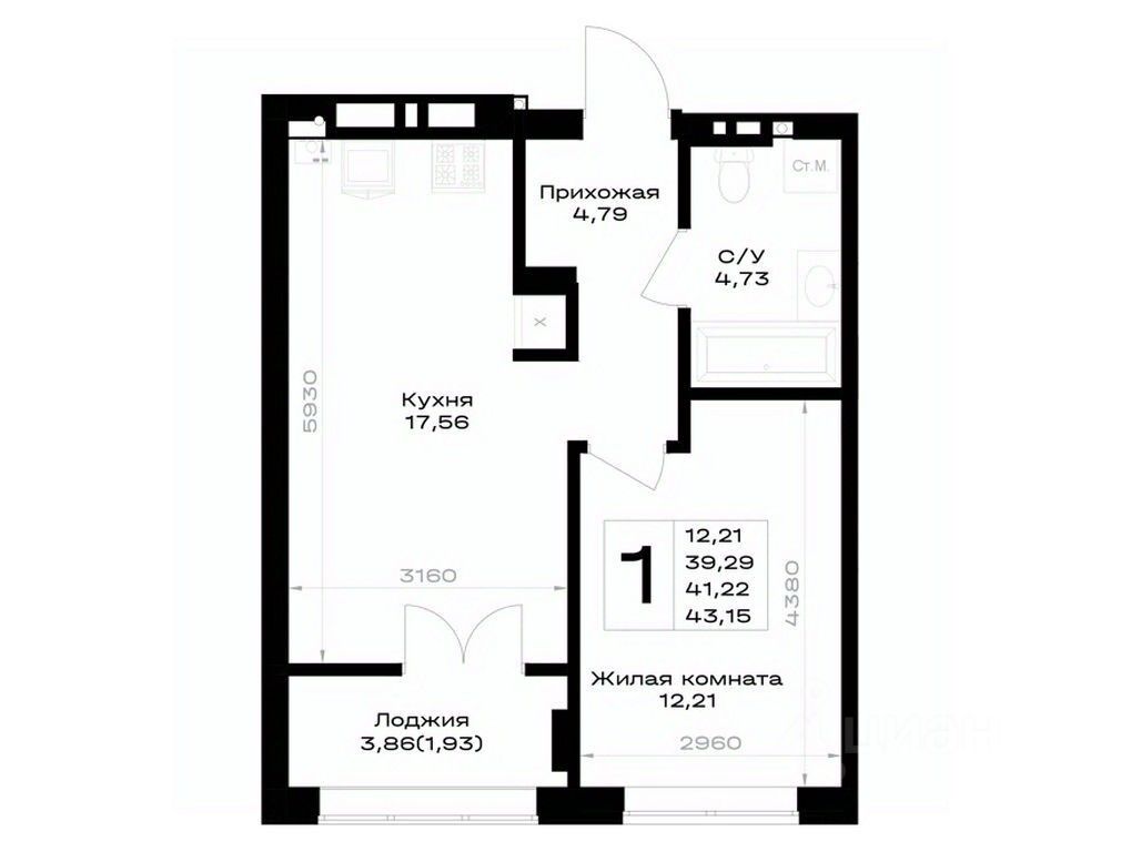 Общая площадь41,22 м²