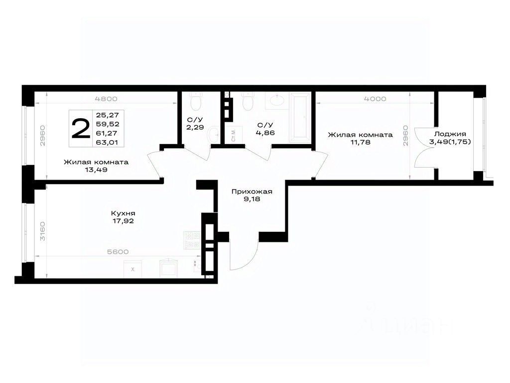 Продается 2-комн. квартира, 61,27 м²