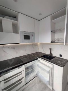 Встроенная кухня с фасадами МДФ-Пластик, скрытые выдвижные ящики Blum, фурнитура Blum.