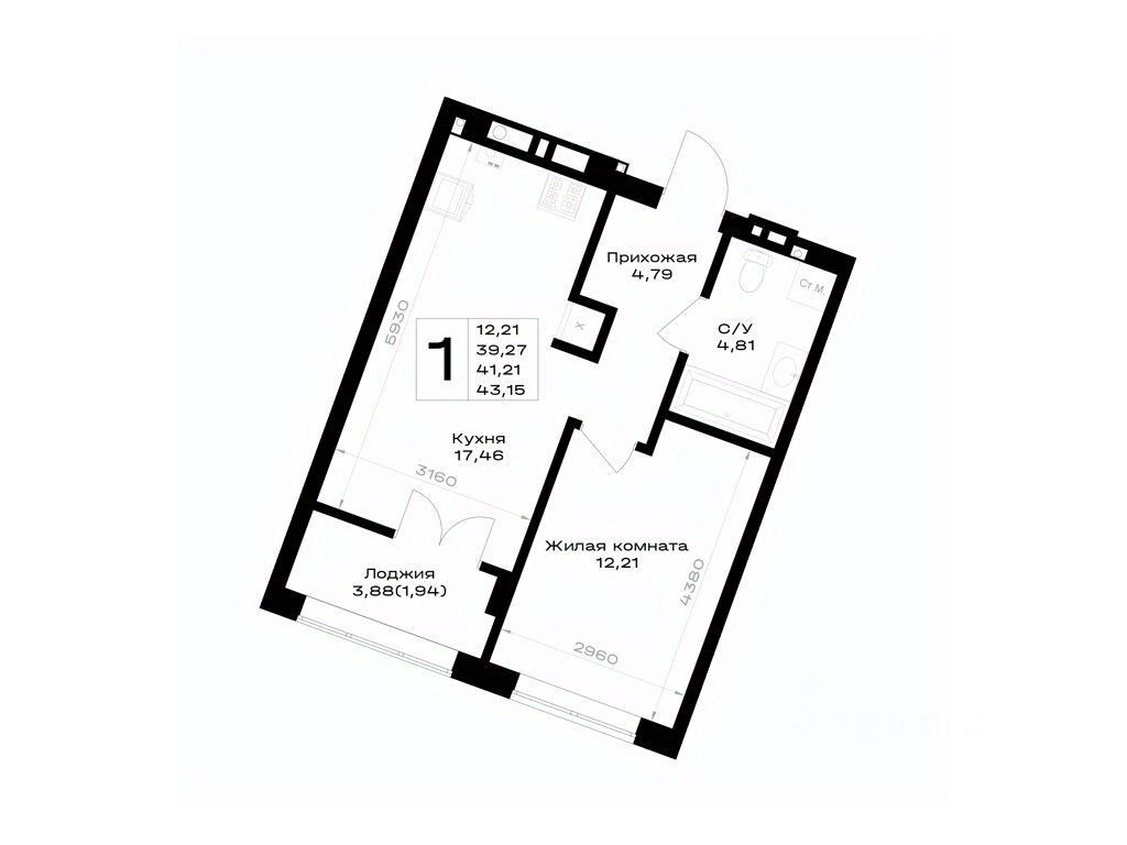 Общая площадь41,21 м²