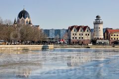 Здание "Рыбной биржи" и набережная реки Преголя (идеально для прогулок).