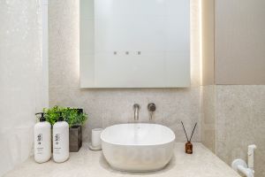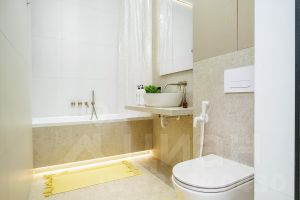 Большой сан узел сделан из качественной плитки привезенной из Германии (индивидуальные смесители, вместо полотенцесушителя удобная теплая стена)