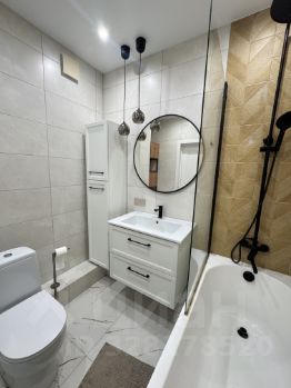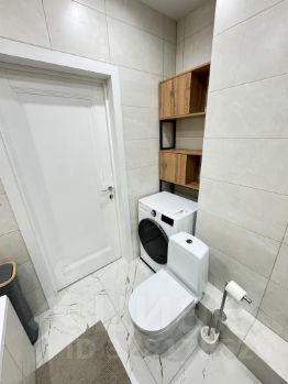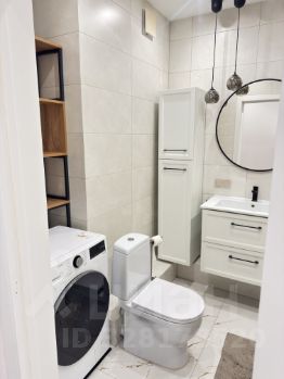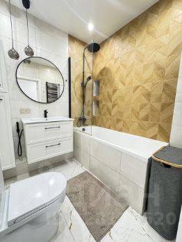 Санузел: стиральная машина с сушкой LG (на гарантии до декабря 2026), душ и ванна, раковина с зеркалом, подвесная тумба, пенал для хранения, стеллаж.