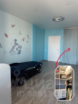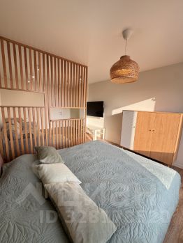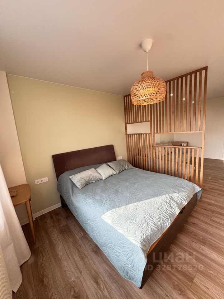 В большой комнате выполнено зонирование ажурной перегородкой из ольхи — спальная зона с полноразмерной кроватью и гостиная зона с диваном, телевизор TCL (4K). Вторая комната — просторная детская в спокойных синих тонах (легко перекрасить в любой цвет) с нишей гардеробом и выходом на застекленную лоджию с окнами в пол с видом на улицу Юбилейная. Просторный коридор.