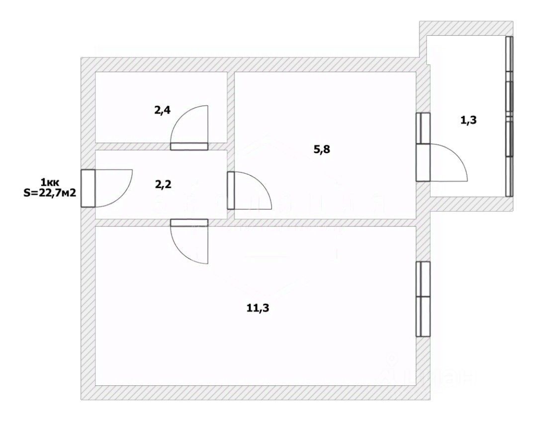 Общая площадь квартиры 21,7 м², включающая в себя очень светлую комнату площадью 11,3 м², удобную кухню, размером 5,8 м², совмещенный санузел с душевой кабиной