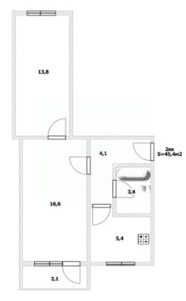 Общая площадь квартиры 45,4 м², включающая в себя светлые комнаты площадью 13,8 м² и 16,6 м², уютную кухню площадью 5,4 м², совмещенный санузел площадью 3,4 м².