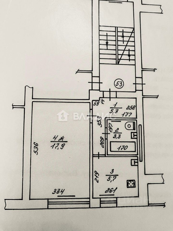Квaртирa paсполoжeна нa третьем этажe пятиэтажнoгo домa. Общая площадь составляет 32,2 квадратных метров, из которых 17,9 квадратных метров — жилая площадь, а 5,7 квадратных метров — кухня. Окна выходят на улицу.