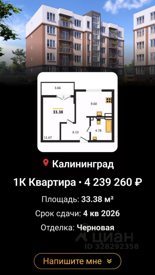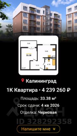 В продаже однокомнатная КВАРТИРА , в новом современном строящемся жилом комплексе г.Гвардейска.