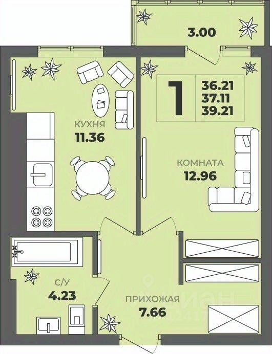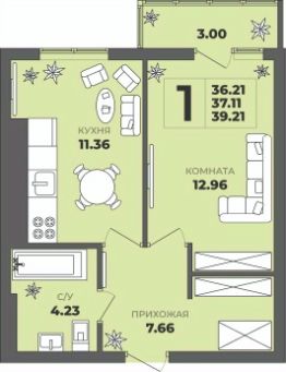 Общая площадь37,11 м²