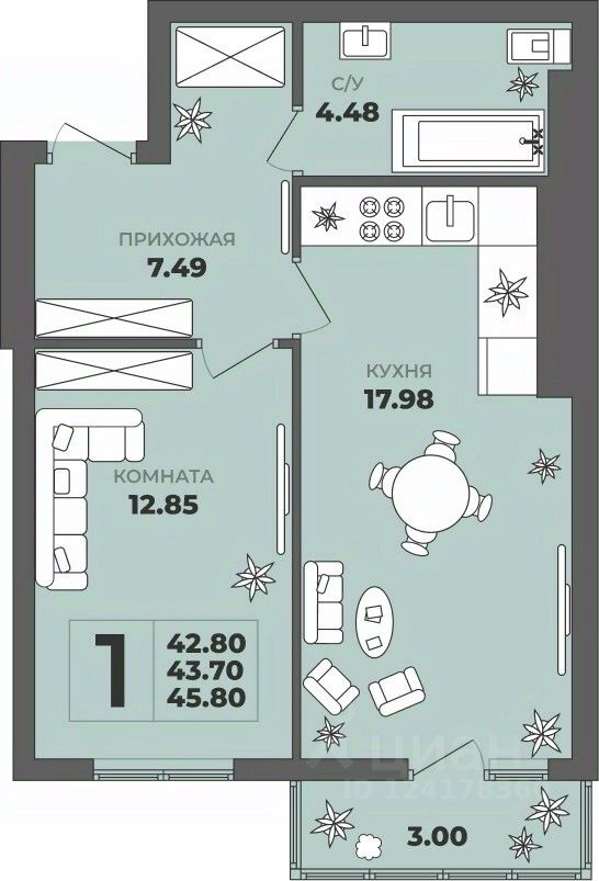 Общая площадь43,7 м²