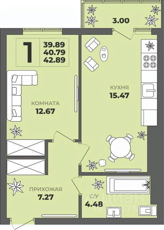 Общая площадь40,79 м²