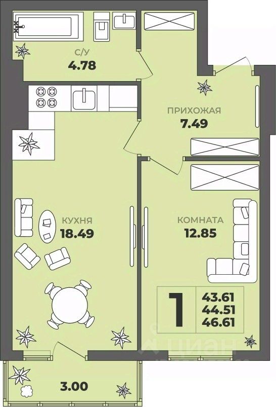 Общая площадь44,51 м²