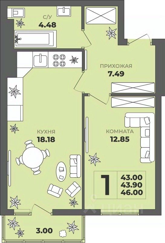 Общая площадь43,9 м²