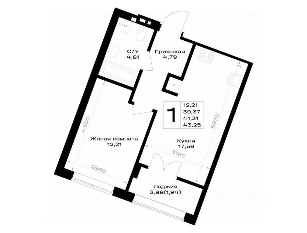 Общая площадь41,31 м²