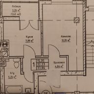 Дом девятиэтажный, кирпично-монолитный, квартира на 6-м этаже общей площадью 33,86 кв.м., комната 15.05кв.м., кухня 7,89 кв.м., сан. узел 5,25кв.м., лоджия из кухни.