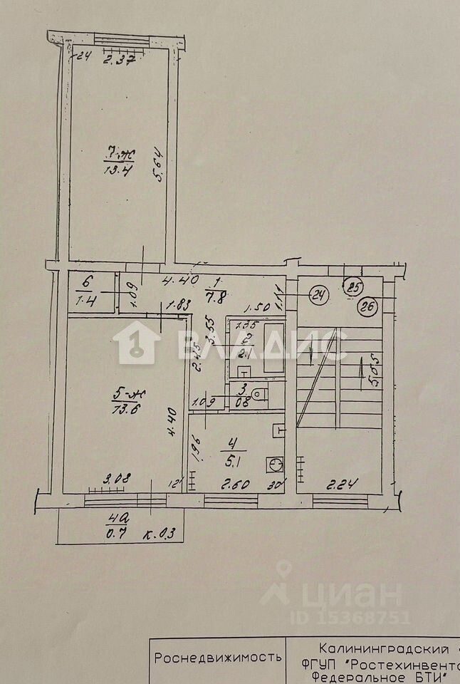 Общая площадь квартиры: 44. 2 кв.м, площадь комнат 13. 4 +13.6 кв. м, площадь кухни 5.1 кв.м, раздельный санузел, застекленный балкон.