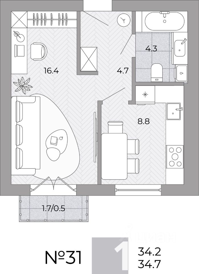 Общая площадь34,7 м²