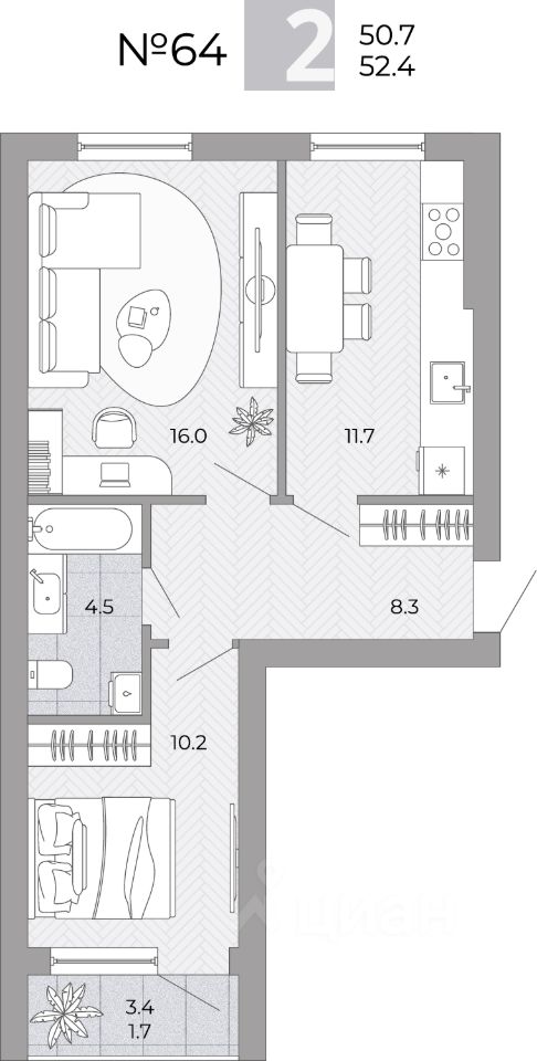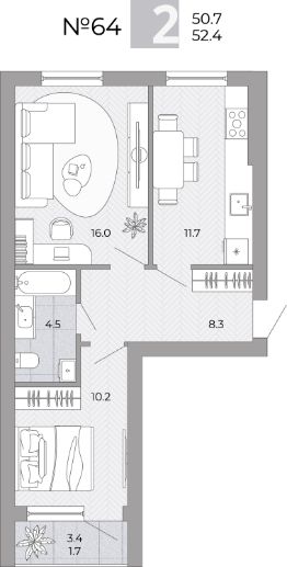 Общая площадь52,4 м²
