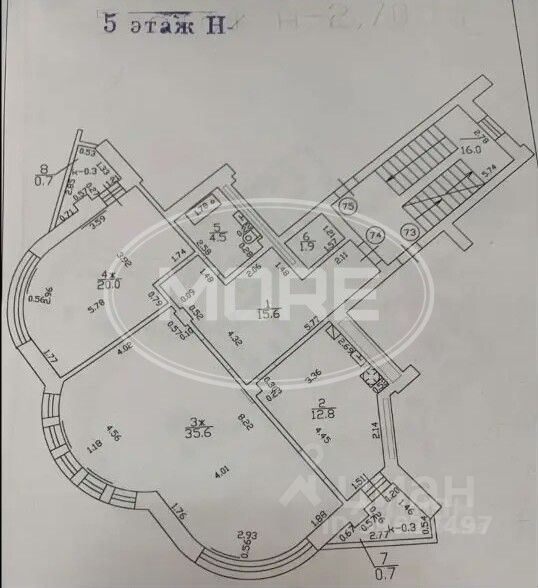 Общая площадь 155,5 кв. м., на 5 этаже расположены: кухня 12,8 кв. м., гостиная 35,6 кв. м., спальня 20 кв. м., коридор 15,6 кв. м. , санузел 4.5 кв. м.