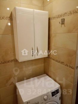 Ванная комната оборудована стиральной машиной, подвесным и напольным шкафами. Все коммуникации скрыты.