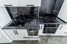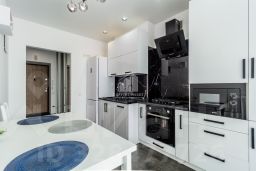 В кухне : дорогая встроенная кухня, посудомоечная машина, вытяжка, духовой шкаф, варочная поверхность, холодильник .