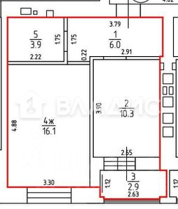 Общая площадь квартиры составляет 39,2 кв.м, в том числе: комната 16,1 кв. м, кухня 10,3 кв. м с выходом на застекленную лоджию 2,9 кв. м. коридор 6,0 кв. м, совмещенный санузел 3,9 кв. м.