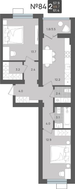 Продаётся 2-комнатная квартира в строящемся доме (Дом 2), срок сдачи: II-кв. 2027, общей площадью 59.7 кв.м., на 1 этаже. Новый жилой комплекс от компании "Макрострой" расположен по адресу: Калининградская обл., г. Пионерский, ул. Рабочая.