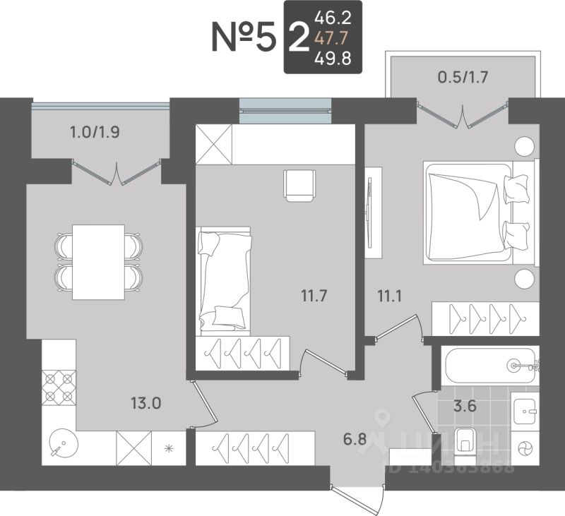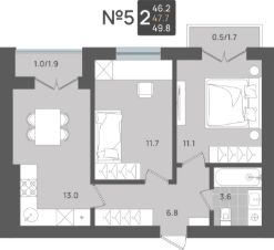 Продаётся 2-комнатная квартира в строящемся доме (Дом 1), срок сдачи: II-кв. 2027, общей площадью 47.7 кв.м., на 1 этаже. Новый жилой комплекс от компании "Макрострой" расположен по адресу: Калининградская обл., г. Пионерский, ул. Рабочая.