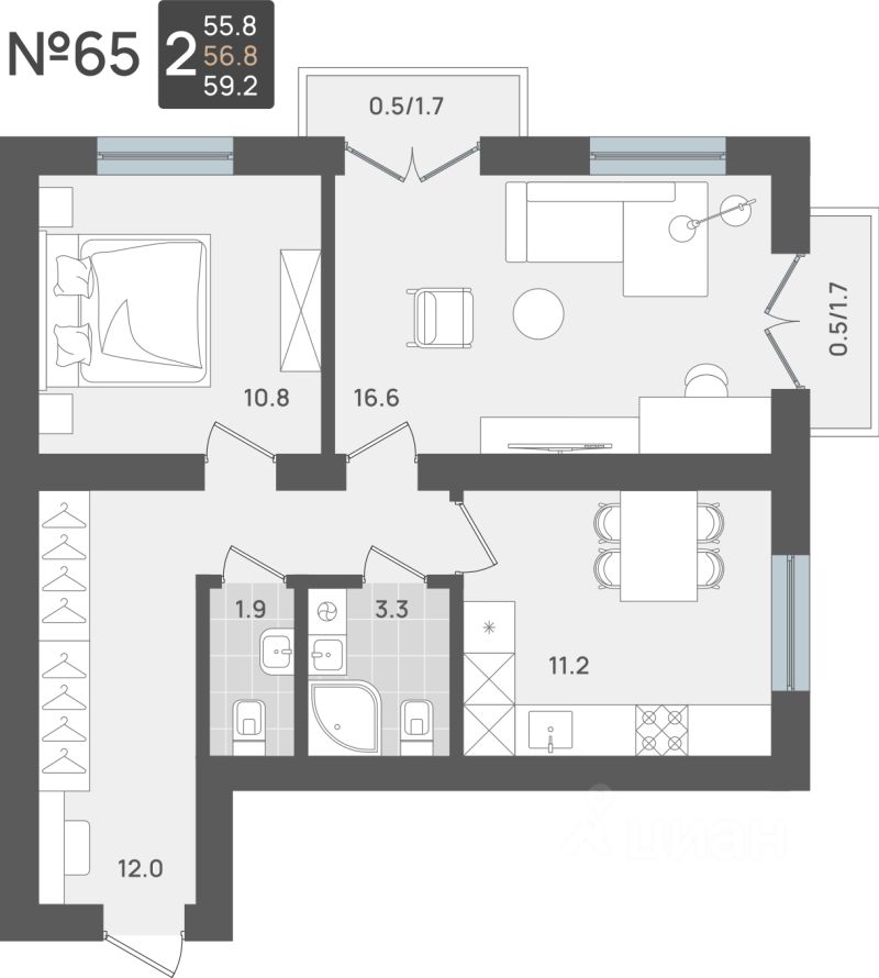 Продаётся 2-комнатная квартира в строящемся доме (Дом 1), срок сдачи: II-кв. 2027, общей площадью 56.8 кв.м., на 3 этаже. Новый жилой комплекс от компании "Макрострой" расположен по адресу: Калининградская обл., г. Пионерский, ул. Рабочая.