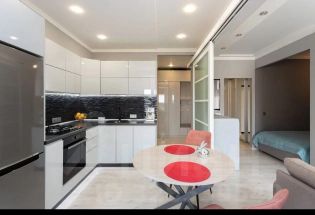 Просторная кухня -столовая зонированна на гостевую, зону приготовления и обеденную зоны. Имеется несколько вариантов освещения .