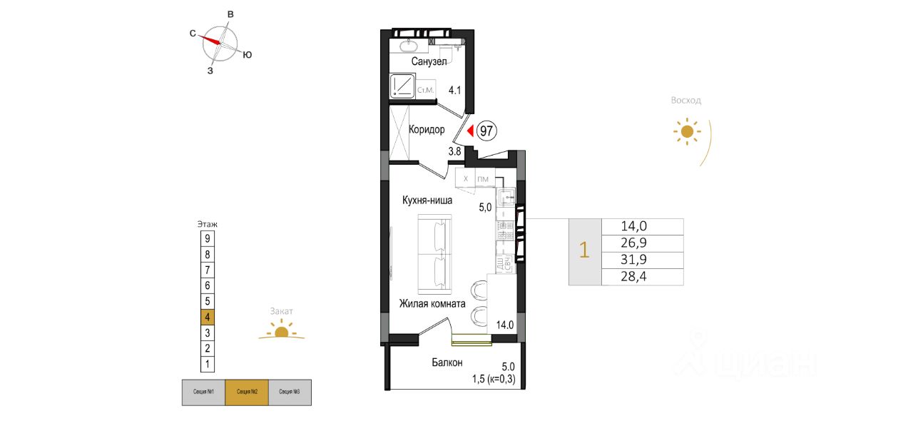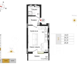 — Общая площадь: 28,4 м² (приведённая, балкон к=0,3)