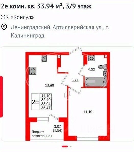 • Жилая комната: 11,19 м²