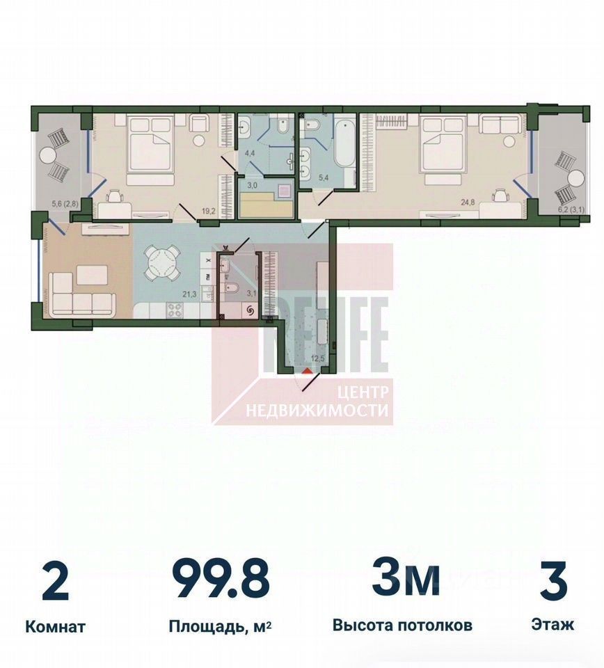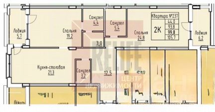 — две просторные спальни 19.2 и 24.8