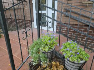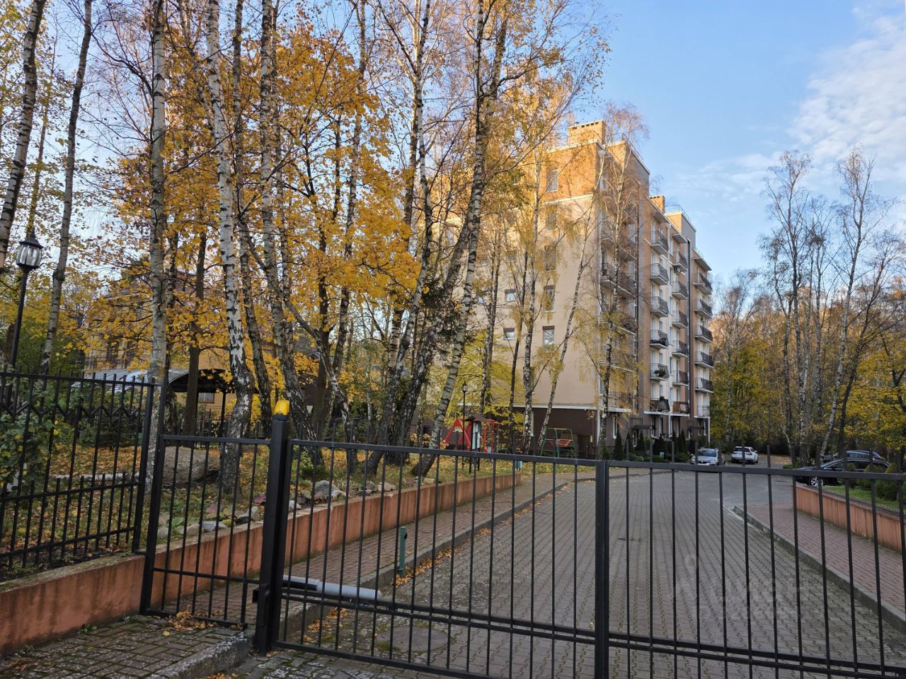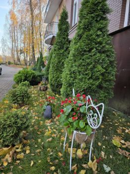 Закрытая большая озелененная территория с ухоженными клумбами, цветниками. С вместительной крытой зоной барбекю, детской площадкой и просторными парковочными зонами.