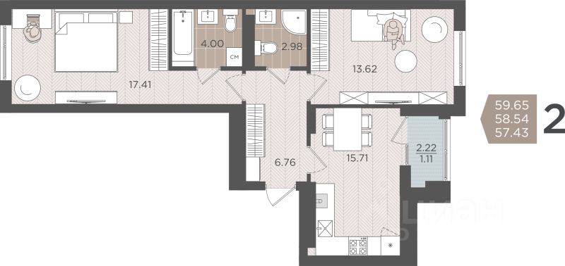 Продаётся 2-комнатная квартира в строящемся доме (Дом 3 (1 этап)), срок сдачи: IV-кв. 2028, общей площадью 58.54 кв.м., на 7 этаже.