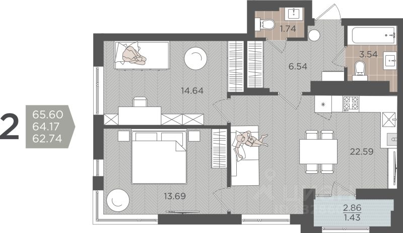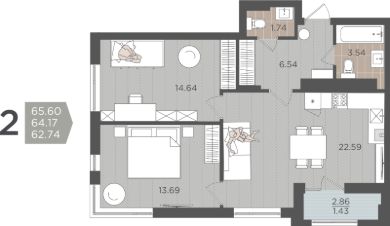 Продаётся 2-комнатная квартира в строящемся доме (Дом 3 (1 этап)), срок сдачи: IV-кв. 2028, общей площадью 64.17 кв.м., на 6 этаже.