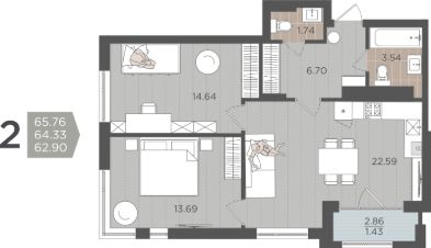 Продаётся 2-комнатная квартира в строящемся доме (Дом 3 (1 этап)), срок сдачи: IV-кв. 2028, общей площадью 64.33 кв.м., на 4 этаже.