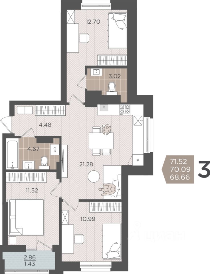 Продаётся 3-комнатная квартира в строящемся доме (Дом 3 (1 этап)), срок сдачи: IV-кв. 2028, общей площадью 70.09 кв.м., на 2 этаже.