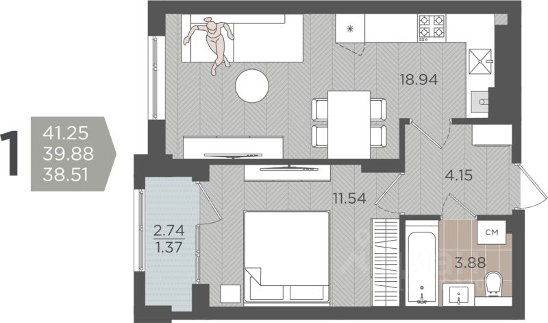 Продаётся 1-комнатная квартира в строящемся доме (Дом 3 (1 этап)), срок сдачи: IV-кв. 2028, общей площадью 39.88 кв.м., на 1 этаже.