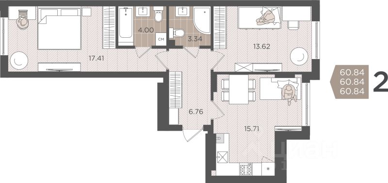 Продаётся 2-комнатная квартира в строящемся доме (Дом 3 (1 этап)), срок сдачи: IV-кв. 2028, общей площадью 60.84 кв.м., на 1 этаже.