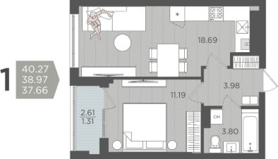 Продаётся 1-комнатная квартира в строящемся доме (Дом 3 (1 этап)), срок сдачи: IV-кв. 2028, общей площадью 38.97 кв.м., на 8 этаже.