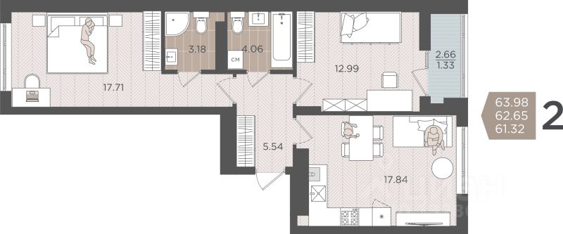 Продаётся 2-комнатная квартира в строящемся доме (Дом 3 (1 этап)), срок сдачи: IV-кв. 2028, общей площадью 62.65 кв.м., на 8 этаже.